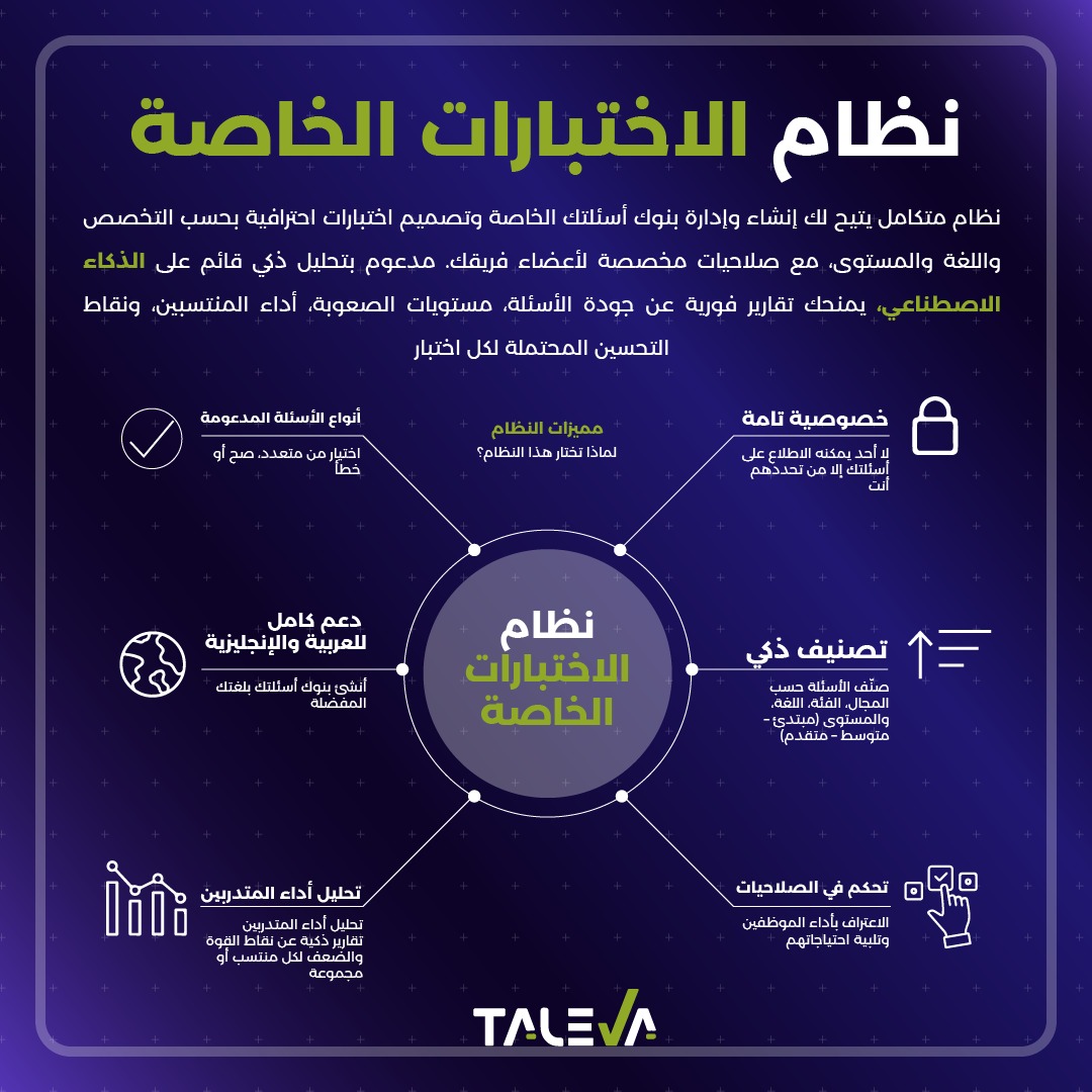 • نظام صلاحيات متكامل لتحديد من يمكنه إنشاء أو إدارة الأسئلة والاختبارات.